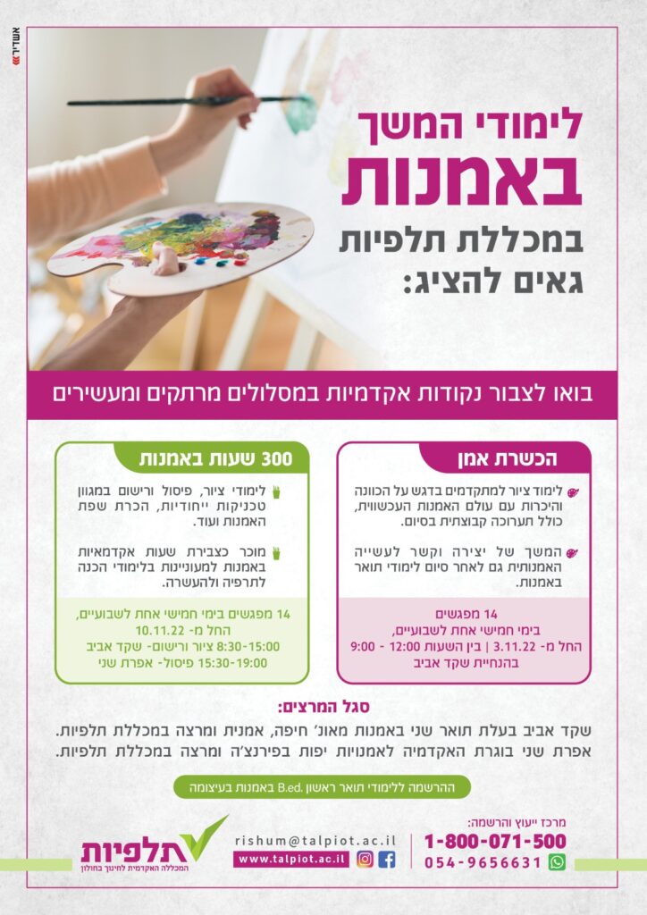 - לימודי הוראת האמנות למגוון גילאים (אפשרות למלגה במסגרת "אקדמיה כיתה" כבר בשנה ג')